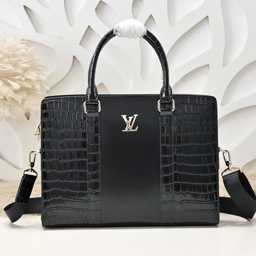 내용: 루이비통 남성 크로커다일 패턴 비즈니스 토트백은 세련된 블랙 컬러와 고급스러운 크로커다일 엠보 가죽이 조화를 이루는 제품입니다. 중앙은 매끈한 가죽으로 마감해 깔끔한 인상을 주며, 전면 LV 메탈 로고가 브랜드 아이덴티티를 강조합니다. 상단 더블 핸들과 탈부착 가능한 롱 스트랩이 있어 토트와 숄더, 크로스 등 다양한 연출이 가능하며, 넉넉한 내부 수납공간으로 노트북과 서류, 일상 소지품을 효율적으로 정리할 수 있습니다. 비즈니스 미팅부터 일상 출퇴근까지 고급스럽고 실용적인 남성 오피스 스타일을 완성해 줍니다.