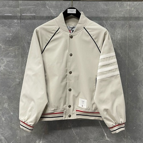 내용: 톰 브라운의 시그니처 디테일이 돋보이는 사선 완장 베이스볼 재킷입니다. 크림 컬러 바디에 네이비 파이핑으로 라인을 살리고, 왼팔의 사선 완장과 밑단·소매의 삼색 리브 조직으로 브랜드 아이덴티티를 강조했습니다. 스냅 버튼 여밈과 여유 있는 실루엣으로 간편하게 착용 가능하며, 안감에는 스트라이프 패턴을 사용해 완성도를 높였습니다. 티셔츠, 셔츠 등과 매치해 일상부터 캐주얼한 외출까지 다양한 스타일링에 활용하기 좋은 남성 아우터입니다.