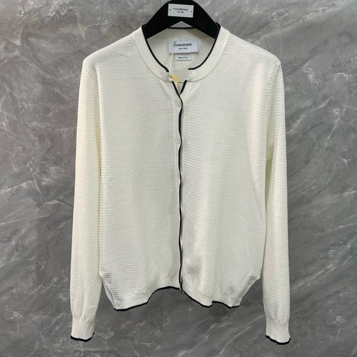 내용: Thom Browne 톰 브라운의 클래식 배색 라운드넥 니트 가디건입니다. 전체적으로 심플한 블랙 컬러에 버튼 라인과 넥, 밑단을 따라 화이트 배색 파이핑을 더해 브랜드 특유의 세련된 분위기를 강조했습니다. 촘촘한 니트 짜임으로 가벼우면서도 보온성이 좋고, 단정한 실루엣으로 셔츠나 티셔츠 위에 걸치기 좋아 비즈니스 캐주얼부터 데일리 룩까지 폭넓게 활용할 수 있습니다. 뒷목의 시그니처 스트라이프 탭 디테일이 포인트가 되어 자켓 안 이너로도 존재감을 더해줍니다.