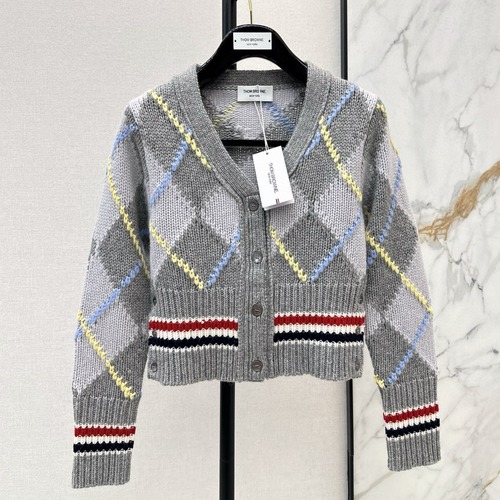 Thom Browne 특유의 클래식한 아카데미 무드를 담은 아가일 크롭 가디건입니다. 레드와 네이비, 화이트가 조합된 대담한 다이아몬드 패턴이 시선을 사로잡으며, 밑단과 소매의 스트라이프 디테일이 브랜드 아이덴티티를 강조합니다. 허리선을 살짝 드러내는 크롭 기장과 슬림하게 떨어지는 실루엣으로 스커트, 슬랙스, 데님 어디에나 경쾌하게 매치할 수 있습니다. 단독으로는 물론 셔츠나 티셔츠 위에 레이어드하면 가을·겨울 시즌 데일리 룩과 캠퍼스 룩을 완성해 줍니다.