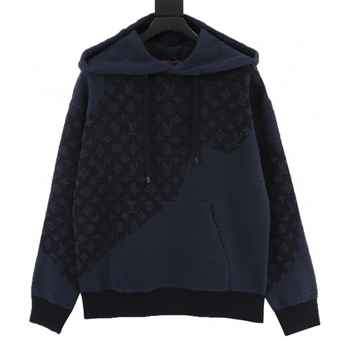 루이 비통 특유의 모노그램 패턴을 사선으로 배치한 네이비 컬러 니트 후드티입니다. 전면과 소매, 후드 부분에 서로 다른 짜임을 사용해 입체적인 질감을 살렸으며, 캥거루 포켓과 조절 가능한 후드 스트링으로 실용성을 더했습니다. 촘촘한 니트 조직과 탄탄한 시보리 마감으로 보온성이 뛰어나며, 간절기부터 한겨울까지 단독 또는 이너로 활용하기 좋습니다. 여유 있는 실루엣으로 다양한 체형을 자연스럽게 커버해 주며, 데님이나 슬랙스 등 어떤 하의와도 조화롭게 매치됩니다. 깔끔한 네이비 톤이라 데일리룩은 물론 세미 캐주얼 스타일에도 잘 어울리는 아이템입니다.
