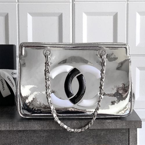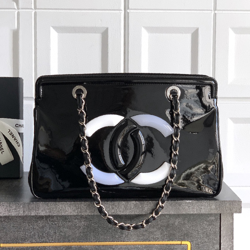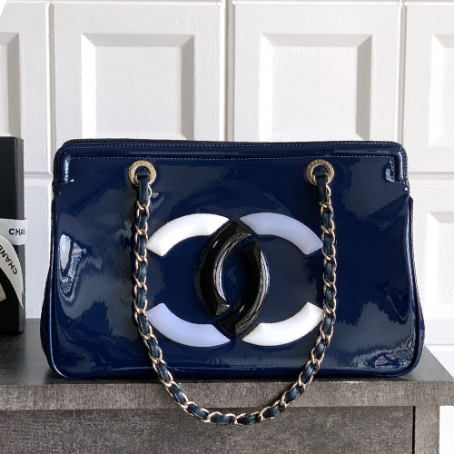 CHANEL 샤넬 보물블루 대로고 래커 카우하이드 토트백