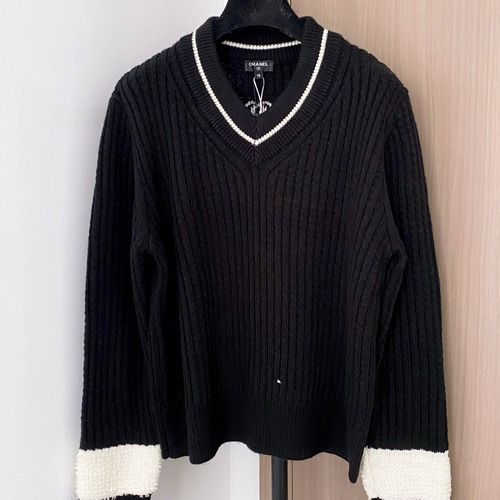 Chanel 샤넬 블랙 화이트 배색 니트 브이넥 스웨터 |