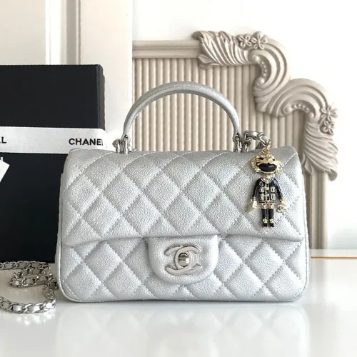샤넬 CF 뉴미니 캐비어 내장칩 탑핸들 메탈실버 은장참 20CM #AS2431