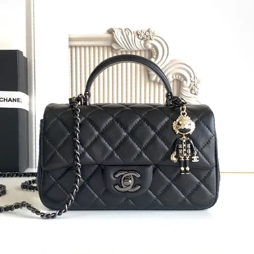 샤넬 CF 뉴미니 램스킨 내장칩 탑핸들 블랙 메탈블랙참 20CM #AS2431