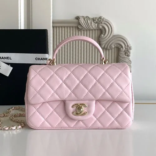 샤넬 CF 뉴미니 램스킨 내장칩 탑핸들 핑크 금장 20CM #AS2431