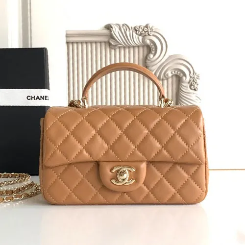 샤넬 CF 뉴미니 램스킨 내장칩 탑핸들 브라운 금장 20CM #AS2431