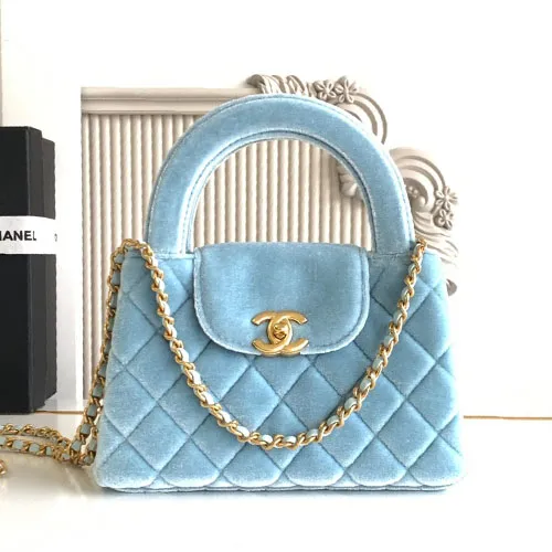 샤넬 실크 벨벳 켈리백 미니탑핸들 파우더블루 19cm AS4416