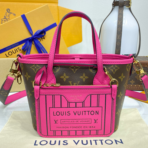 루이 비통 네버풀 반둘리에 인사이드 아웃 BB 토트백은 클래식한 네버풀 디자인을 현대적으로 재해석한 더블 사이드 버전입니다. 아이코닉한 모노그램 캔버스와 그레인 가죽이 양면에 각각 적용되어 독특한 매력을 선사하며, 특히 M12106 모델은 생동감 넘치는 핑크 컬러로 포인트를 주어 시선을 사로잡습니다.