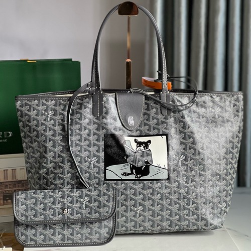 이 제품은 Goyard의 상징적인 ‘Saint Louis PM’ 모델로, 경쾌하고 넉넉한 수납력을 갖추면서도 부드럽고 가벼운 착용감을 제공합니다. 본 문구에는 “클래식 패턴 표면에 독특한 Hulot 그림이 더해져 재미와 귀여움을 동시에 담았으며, 대용량이면서 동전 지갑 및 가방 펜던트를 포함해 안전성과 장식성 모두 충족한다”고 설명되어 있습니다. 입구 폭 약 47 cm, 바닥 길이 34 cm, 바닥폭 14 cm, 높이 27 cm로 안내되어 일상 또는 여행용으로 활용하기 적합합니다.