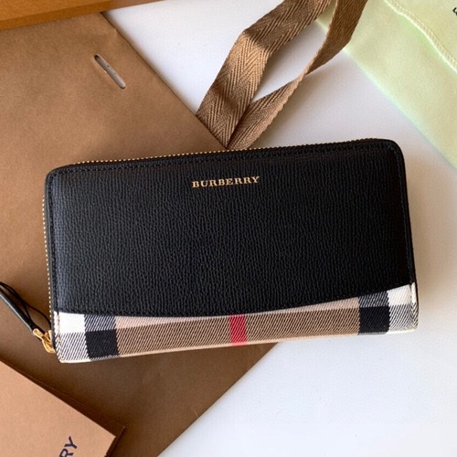 버버리의 클래식한 하우스 체크와 고급스러운 블랙 소가죽이 조화를 이룬 지퍼 장지갑입니다.