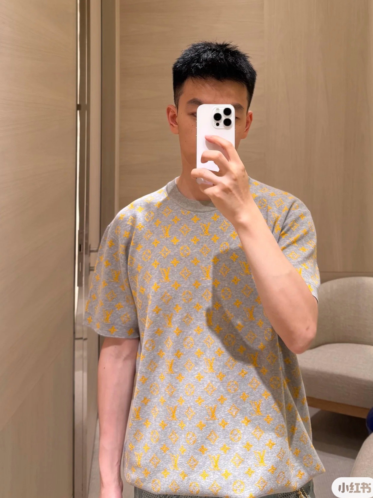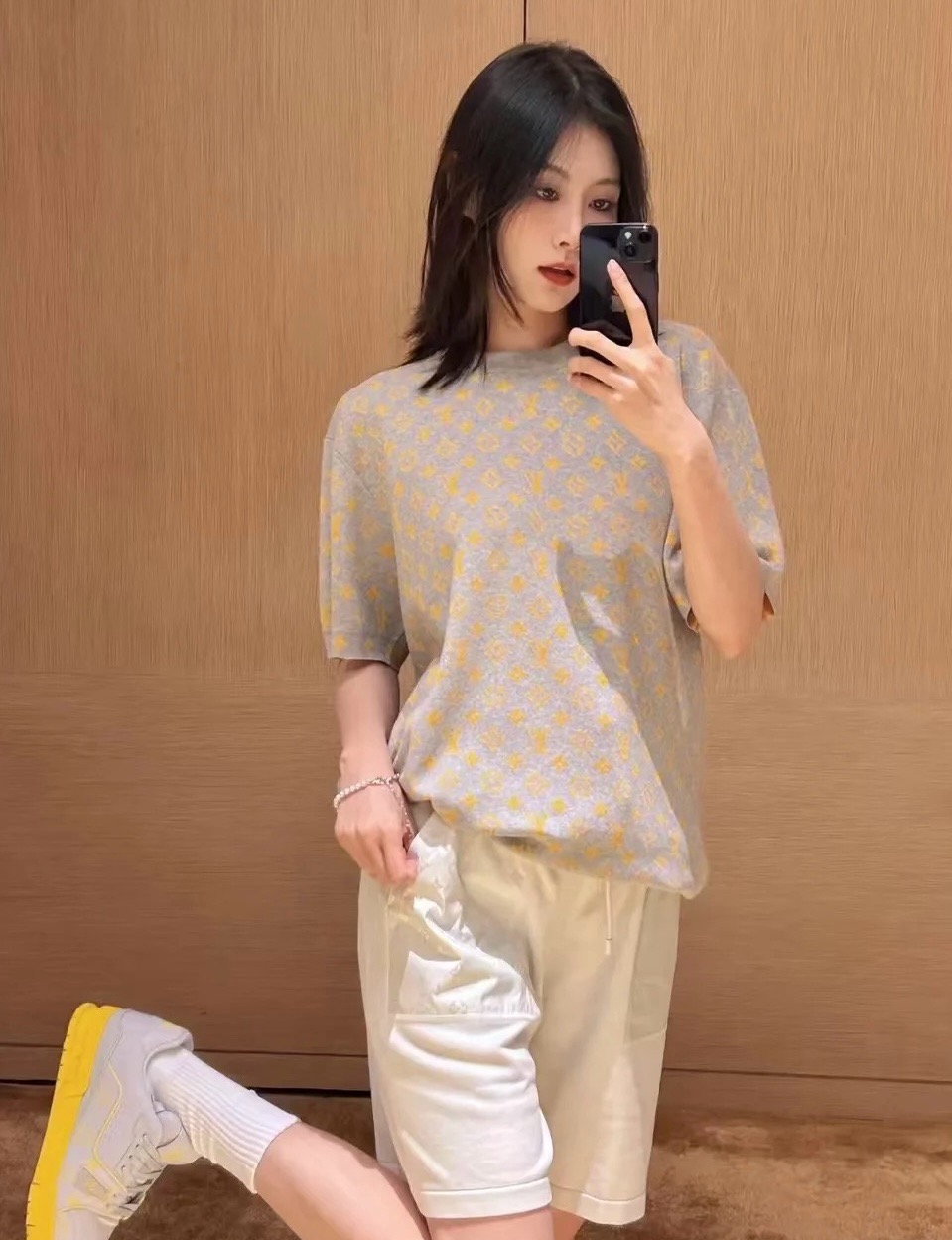 2025년 여름 신상, 전면에 노란색 자카드 알파벳이 가득한 니트 반팔 티셔츠. 캐주얼하고 어떤 스타일에도 어울리며 남녀 공용입니다.