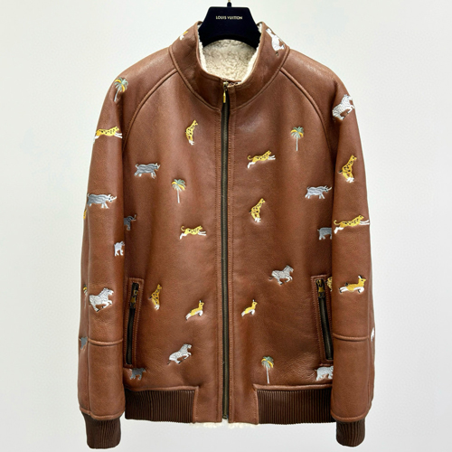 이 루이비통 1V 자수 봄버 재킷은 고급스러운 가죽 소재와 독특한 동물 자수가 특징입니다. 클래식한 봄버 재킷 디자인에 귀여운 동물 모티브 자수가 더해져 캐주얼하면서도 개성 있는 스타일을 연출합니다.