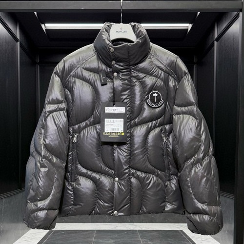 몽클레어와 팜엔젤스의 콜라보레이션으로 탄생한 Haunani 다운 재킷입니다. 레이싱 트랙에서 영감을 받은 곡선과 점선 패턴이 특징이며, 몽클레어 로고와 팜엔젤스 로고가 결합된 디자인이 돋보입니다.