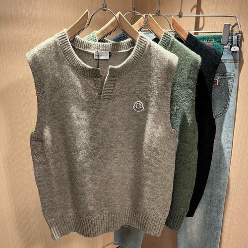 Moncler 2025 F/W 시즌 남녀공용 커플 니트 베스트로, 최신 무역 오더라인 제품입니다. 고급 울 혼방 니트 소재로 제작되었으며, Moncler 시그니처 로고 자수로 포인트를 더했습니다. 전체적으로 부드럽고 입체감 있는 짜임이 돋보이며, 품질은 수출용 오더 수준으로 매우 우수합니다.