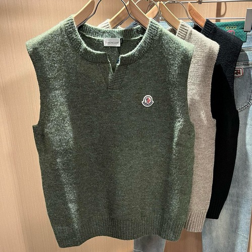Moncler 2025 F/W 시즌 남녀공용 커플 니트 베스트로, 최신 무역 오더라인 제품입니다. 고급 울 혼방 니트 소재로 제작되었으며, Moncler 시그니처 로고 자수로 포인트를 더했습니다. 전체적으로 부드럽고 입체감 있는 짜임이 돋보이며, 품질은 수출용 오더 수준으로 매우 우수합니다.