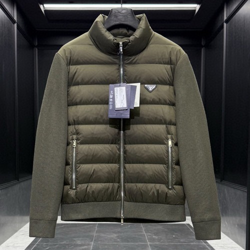 프라다의 Re-Nylon 패딩 자켓입니다. 소매와 뒷면 일부는 니트 소재로 되어 있으며, 앞면은 패딩 처리되어 보온성을 높였습니다. 가슴 부분에는 프라다의 상징적인 삼각 로고가 부착되어 있습니다.
