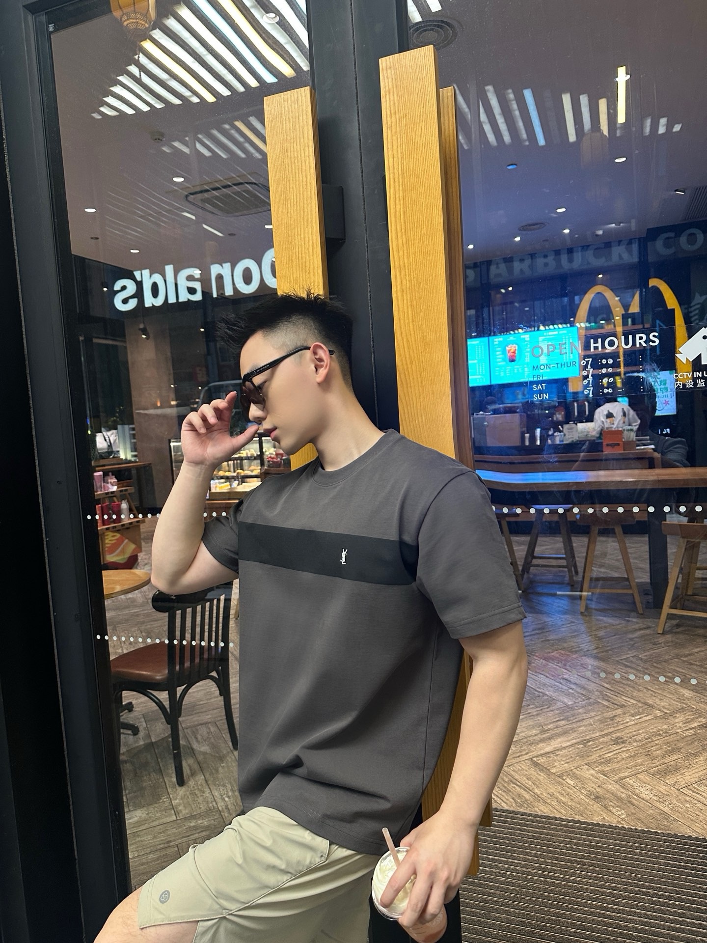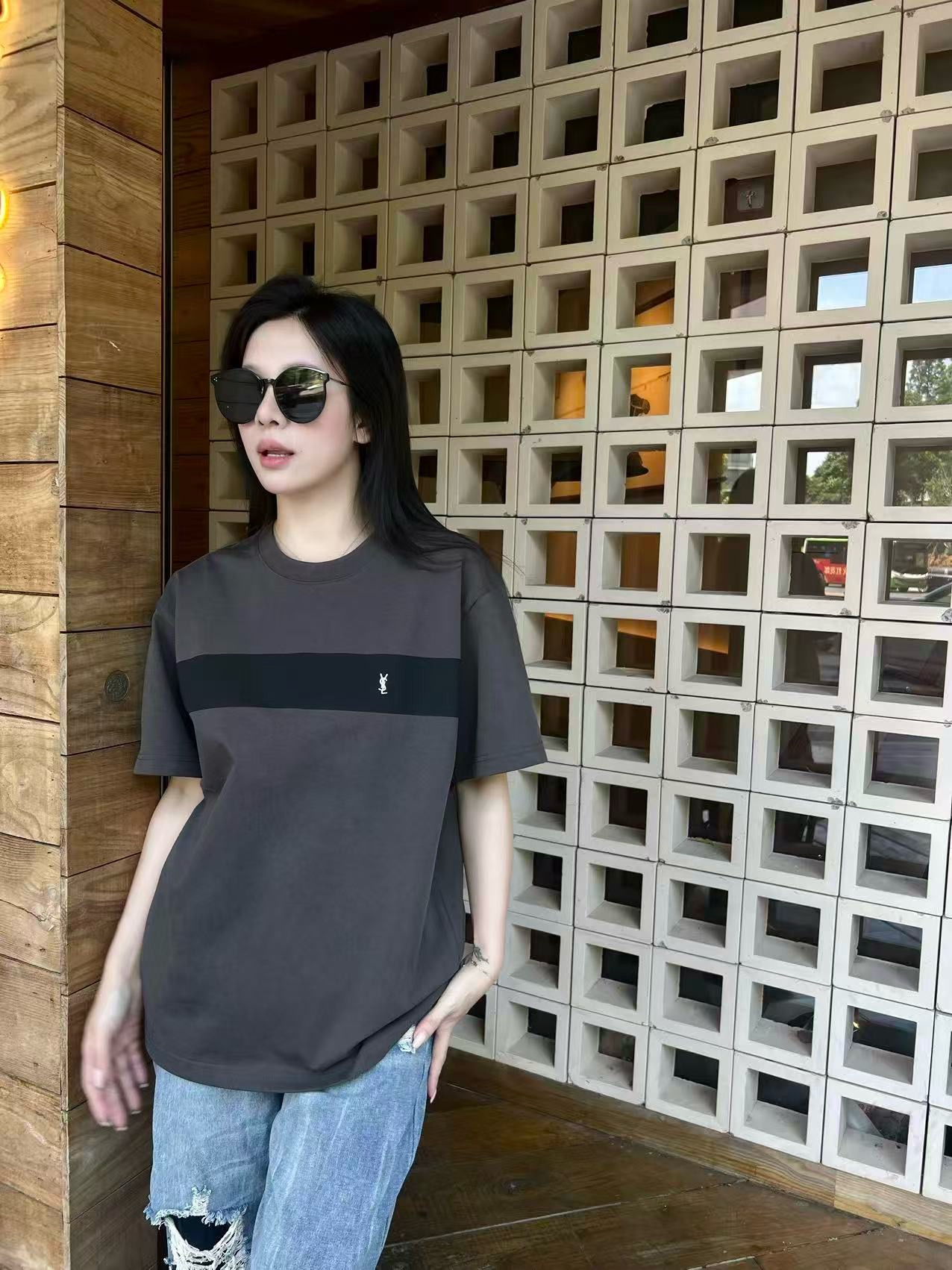 이 제품은 패션과 고급감을 완벽하게 결합한 아이템입니다. 안정감 있는 짙은 회색 베이스에 개성 있는 블랙 스트라이프가 조화를 이루며, 심플하면서도 세련된 분위기를 연출합니다. 왼쪽 가슴에 정교하게 수놓아진 화이트 YSL 자수 로고는 절제된 고급스러움을 드러냅니다.