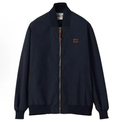 네이비 컬러의 플라이트 자켓으로, 전면에 Miu Miu Logo 자수 패치가 포인트로 들어간 디자인입니다.