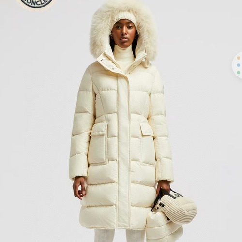 몽클레어 여성용 롱 다운코트로, 탈부착 가능한 대형 퍼후드가 특징입니다. 고급스러운 광택감이 있는 화이트 패브릭으로 제작되었으며, 안감에는 정품 디테일의 만화 라벨이 포함되어 있습니다. 허리 조절 끈과 가죽 지퍼 풀러, 로고 자수 패치가 디자인 포인트로 들어가 있습니다. 보온성과 스타일을 모두 갖춘 고급 겨울 아우터입니다.