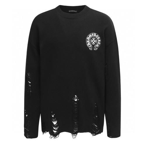 크롬하츠 마름모 찢김 니트입니다. 전체적으로 찢김 디테일이 들어가 있으며, 가슴 부분에 크롬하츠 로고가 프린팅 되어 있습니다.