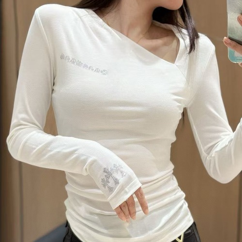 25년 초가을 신상 시리즈로, 크롬하츠 특유의 로고가 큐빅 장식으로 새겨진 브이넥 긴팔 상의입니다. 독특한 넥라인 디자인으로 목선을 아름답게 강조하며, 부드러운 원단으로 편안한 착용감을 제공합니다. 고급스러운 광택감이 있으며, 몸에 자연스럽게 핏되어 여성스러운 실루엣을 연출합니다. 두 가지 컬러로 구성되어 있으며 S/M/L 사이즈로 출시되었습니다.
