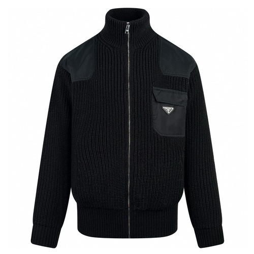 프라다 삼각 로고 니트 아우터. 맞춤 제작된 오스트레일리아산 면혼방 원사로 짜여 고급스럽고 밀도감이 있으며, 두께감이 있어 탄탄한 착용감을 제공합니다.