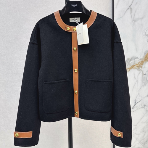 CELINE 25Ss秋冬新款凯旋门扣羊绒外套,高级的焦糖色系皮边撞色,百分百真皮手工油边工艺,复古又高级。羊毛面料手工制作,质感厚实又柔软,减龄学院风小圆领双口袋,落肩宽松版型,上身随性又时髦,颜色质感非常高级,一色现货发售。