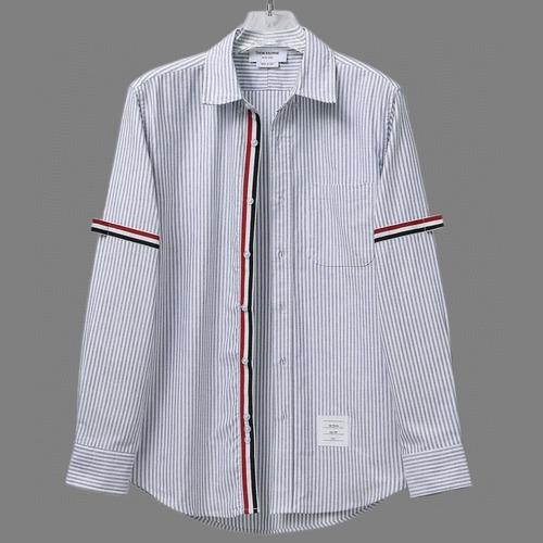 톰브라운의 TB 스트라이프 더블 슬리브 셔츠입니다. 스트라이프 패턴이 돋보이며, 더블 슬리브 디자인이 특징입니다.