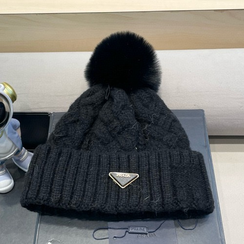 고급스러운 프라다 삼각 로고와 부드러운 폭스퍼 볼이 포인트인 여성 니트 비니입니다.