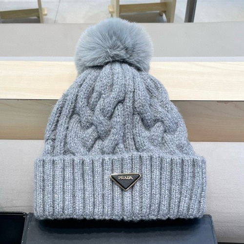 고급스러운 프라다 삼각 로고와 부드러운 폭스퍼 볼이 포인트인 여성 니트 비니입니다.
