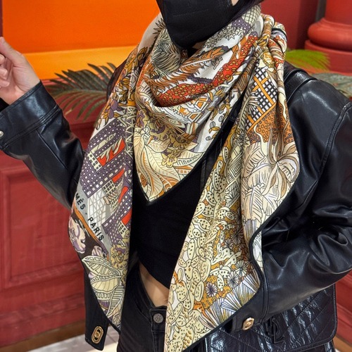 핸드롤 엣지(Hand Rolled Edge) 공정으로 제작되어 자연스러운 곡선 라인과 고급스러운 마감이 특징이며, 에르메스 특유의 예술적인 패턴이 풍부한 컬러감으로 표현되었습니다.